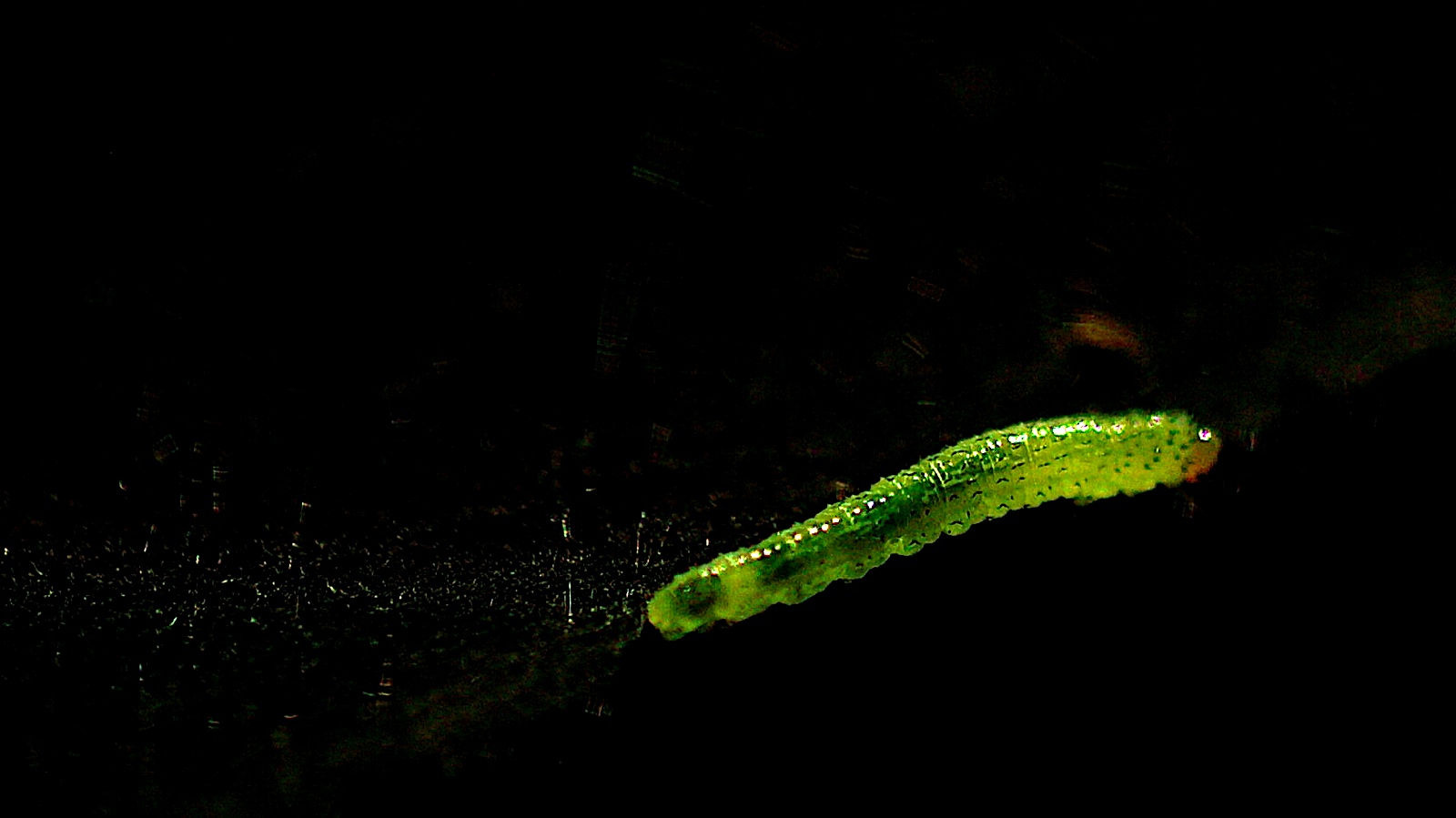 In order to make the scene a little more dramatic, I darkened the shadows and brightened the highlights in photoshop. The green was fairly bright on its own, but I emphasized it a little more to capitalize on the glowing effect. A small sliver of sunlight was naturally hitting the fencepost right where the caterpillar was, so it was a bit of glow that attracted my eye to him in the first place. I think he was about 1.5 cm long. |