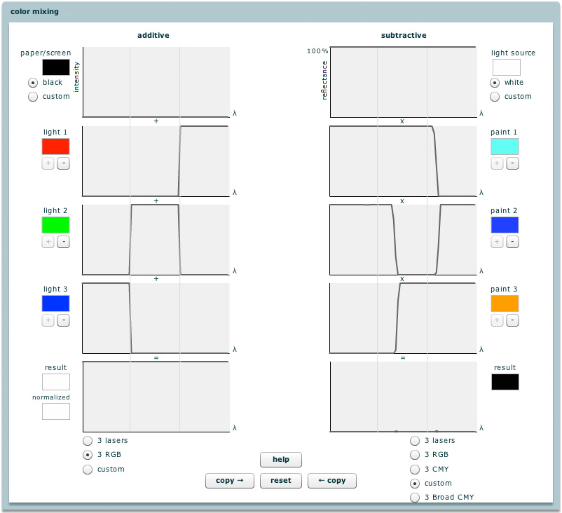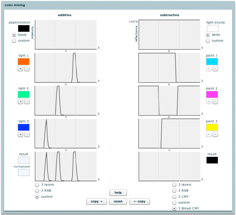 To see how this works, look at the subtractive side of the applet above. With the "3 lasers" button pressed, "filter 1" through "filter 3" represent extremely narrowband filters, i.e. filters that permit light of only one wavelength to pass through. Filters this narrow are difficult to achieve in practice, but never mind. Multiplying the light's SPD, which is set to equal-energy white, by the three absorption spectra in sequence (think of three filters stacked one atop the other and placed in the path of the light) leaves a zero-everywhere SPD, which looks black. Now switch to "3 RGB". It produces black as well. These are the same filters we abstractly placed in front of white lights to produce the three colored lights of our additive system, but whereas the additive system produced white, the subtractive system produced black! The key is that in one case we were superimposing colored lights, so we added the spectra wavelength by wavelength, while in the second case we were stacking colored filters, so we multiplied the spectra wavelength by wavelength. The results of adding versus multiplying spectra are very different.