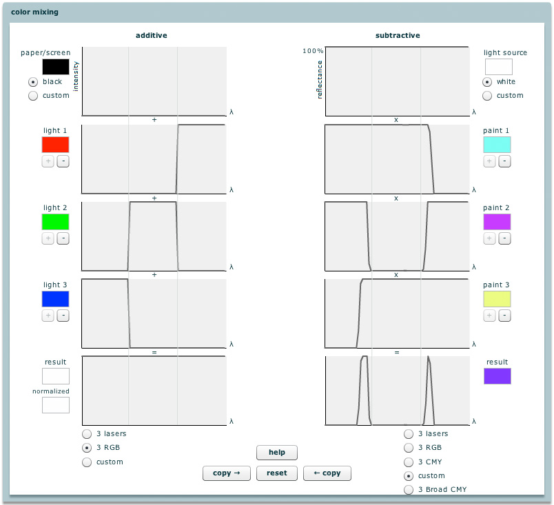 In the preceding applet, we discussed the range of colors (called the gamut) produced by mixing primary colors additively - as in television sets and computer displays, versus mixing them subtractively - as in printing. But what is meant by additive versus subtractive mixing? How does each work at the level of individual wavelengths? And what are the "right" primaries anyway - red, green, and blue? Or cyan, magenta, and yellow? Or red, blue, and yellow, as we learned in nursery school?