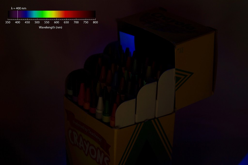This was another fun photo to take. This photo should display an animate gif of a box of crayons under monochromatic illumination with light wavelengths ranging from 400 nm to 700 nm and also under normal white light. I know that other students have uploaded animated gifs before. I can't see the animation here, but hopefully it will work for the peer reviewers. I created these pictures in my group's lab at Stanford. I regularly use a solar simulator light source for my solar energy-related research. When I first read the Light and Color requirement, I immediately thought of using my group's lamp and monochromator for the colored light source. After a bit of thinking, I decided that a box of crayons would be a cool subject because it contains many different colors. I took this series of photos pretty quickly so that I would not interfere with the other lab members who needed to use the lamp for actual research, so this experiment wouldn't meet the rigorous standards that I'd normally apply to my lab work, but I think it is pretty good for the purposes of this class. The light source is a 1000 W xenon arc lamp that produces white light that is a good approximation of the solar spectrum. To generate light of (nearly) a single wavelength, I used our monochromator, which employs a diffraction grating to separate the photons of different energies from the white light. I selected wavelengths ranging from 400 nm to 700 nm in 25 nm increments. I optimized the settings of the monochromator to achieve the highest possible intensity, which meant I had to compromise on the spectral purity. The wavelengths I indicated in the gif are the peak wavelength for each illumination condition, but the light also contains other wavelengths within approximately +/- 20 nm of this peak. To take the photos, I set my camera on a tripod and focused on the box of crayons. I placed a small piece of white paper at the top of the box as a white reference. I used an aperture of f/5.6 to gather light quickly, and ISO of 100 for low noise, and a 1 s shutter speed for a proper exposure. For the full spectrum white light illumination, the light intensity was higher, so in this case I used a shutter speed of 1/20 s. For all the photos, I set the white balance on my camera to daylight. This corresponded to a color temperature of 5200 K on my Canon camera. After capturing the images, I did not perform any of my usual adjustments with Adobe Camera Raw I opened the photos in Photoshop straight away. I set up the photos in a stack. I added in the visible spectrum with some labels and the wavelength marker and superimposed this image on each frame to display the illumination condition. Then I used the timeline to create an animated gif. I chose the animation because I think it highlights how certain crayons change color dramatically with small changes in the illumination wavelength. For example, note the crayons near the upper left of the box in the wavelength range of about 500 nm to 600 nm. I really like watching the colors change with different wavelengths. One downside to the animated gif format is that it only allows for 256 colors. In spite of this shortcoming, in my opinion this gif still displays the colors of the various crayons clearly enough to be interesting and useful. One other important note: the photos at 400 nm and 700 nm look very dim, but close to normal (i.e. white light) coloration. The intensity of the illumination under these conditions was definitely sufficient to be detected by my eye, but I think these wavelengths are not detected by the camera's sensor. The reason that the crayons appear dim but normal colored is that there was some stray light that leaked into this setup from the room. We have a black shroud that prevents outside light from leaking into the system during our measurements, but I couldn't fully enclose the system in the shroud without blocking the camera, so some ambient light leaked in. If I were to do this experiment again, I would design a better light blocking system to make sure that the monochromatic light was always the only important light source.