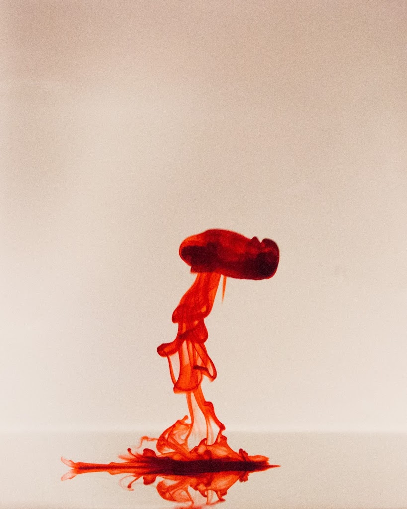 This photo was taken in my friend's room using dye and a vase. I set up a clear rectangular vase he had and placed it against the white wall of my room. I filled the vase with water and had my friend help me squirt drops of ink into the water while I stood ready to capture the action. I used a short exposure time of 1/30 in order to freeze the motion as well as a small aperture of f/5.6 and ISO 2000. In photoshop, I simply cropped the photo to remove parts of the vase that were visible and upped the contrast.