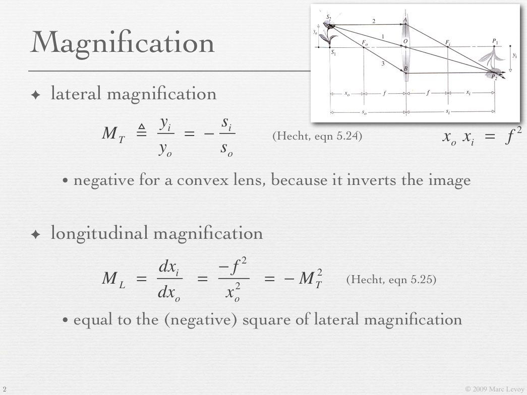 Although it's beyond the scope of this applet, it can be shown that for any focal length, object distance, and image distance, the longitudinal magnification is equal to the square of the lateral magnification. Slides 40 and 41 from the lecture titled "Optics I: lenses and apertures", reproduced at left, sketch the proof. A complete derivation can be found in Chapter 5 of Hecht. It is this non-linear relationship between longitudinal and lateral magnification that gives the image space replica of an object space cube its characteristic frustum shape in the preceeding applet. |