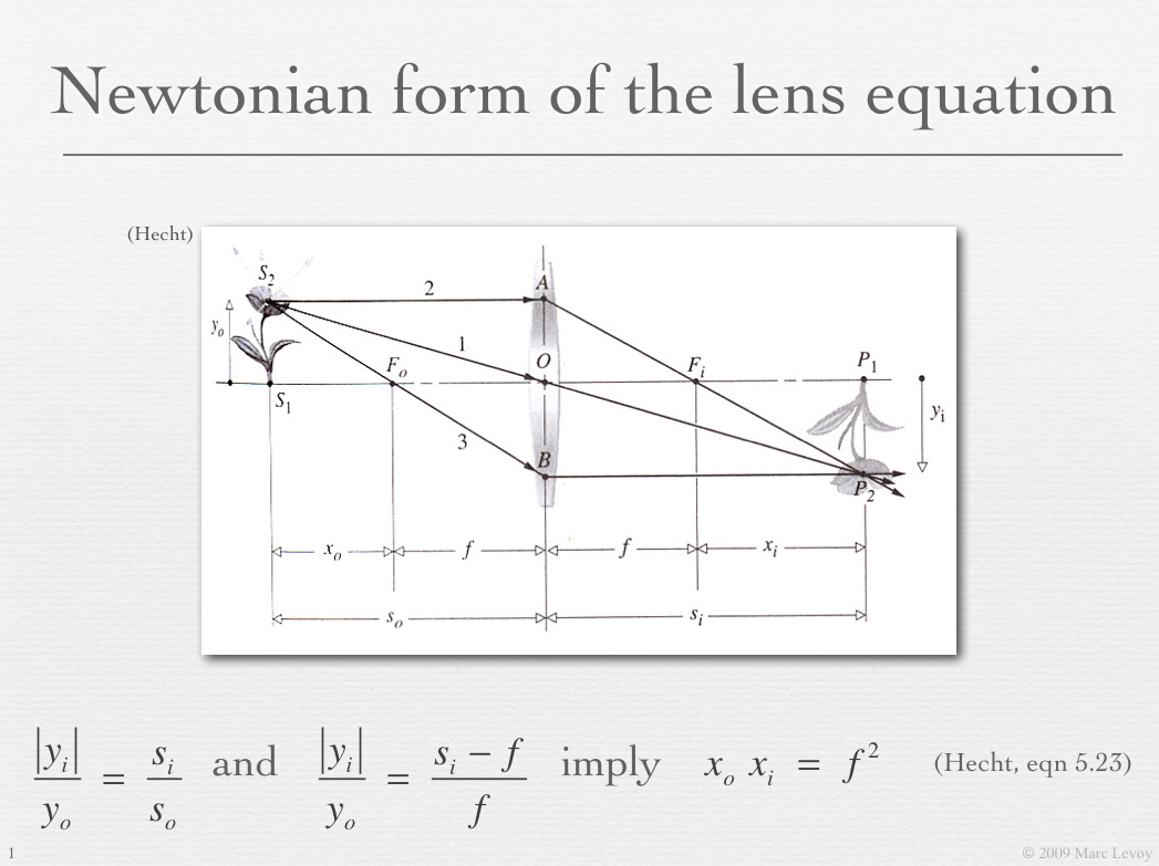 It is beyond the scope of this applet to derive the Gaussian lens formula. Suffice here to say that it can be derived directly from Snell's law of refraction, making only a few assumptions along the way. The steps in this derivation, the geometrical constructions required, and some of the algebra can be found in slides 15-23 of this lecture, or in simplified form in slides 24-26 of the same lecture. A complete derivation can be found in any undergraduate textbook on optics, such as Chapter 5 of Hecht's Optics.
