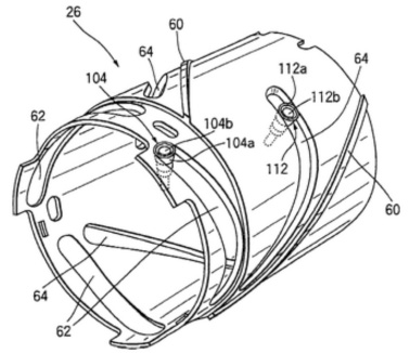Try changing the focal length. The two lenses move, and the field of view changes. So it's a telephoto zoom lens. But the in-focus object plane and sensor also remain stationary. So it's a optically compensated telephoto zoom lens. It's interesting to see how the two lenses move; they don't move together. Explaining how we compute their motion is beyond the scope of this applet; we do it using ray transfer matrices. Briefly, any system of thin lenses and air gaps can be modeled as a 2 x 2 matrix describing how that system bends and shifts rays of light. By constructing and equating the matrices for an ideal thin lens and a telephoto zoom lens system, we can derive equations that make one system optically equivalent to the other. In a commerical lens these motions are encoded into curved slots in the sides of the lens barrel, as suggested by the patent application drawing at left.