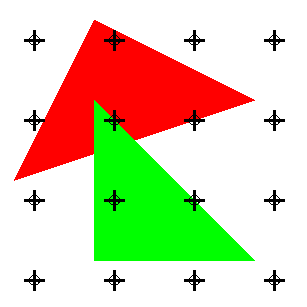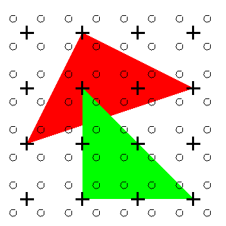 Figure 1 Normal scan conversion (1) Source triangles with pixel centers as crosshairs. Note that sample locations (empty circles) coincide with pixel centers. (2) Scan converted image. We assume that hitting the edge of a triangle constitutes a 'hit'.