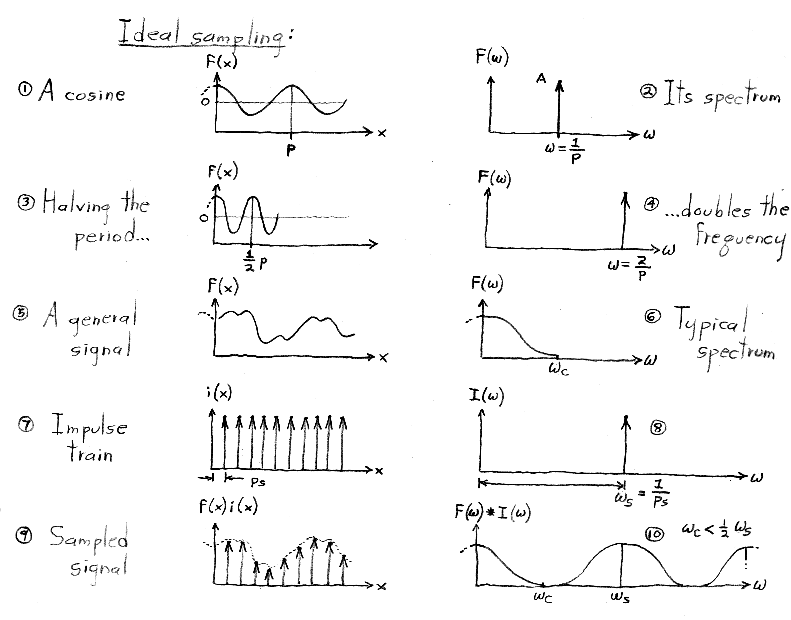 Although we do not manipulate impulses or impulse trains algebraically in this course, you might be wondering how they are defined. The single impulse function, dirac-delta(x), is defined as the limit of a rect function as its width goes to zero. It is drawn as a single upwards-pointing arrow of unit height located at x = 0. (The rect function, you may remember, has unit height, unit width, and is centered around x = 0.) The impulse does not have a value per se at x = 0, but is instead defined as having value = 0 for x <> 0 and integral (from negative to positive infinity) = 1. The impulse train, a.k.a. shah(x), is defined as a sum of shifted impulses. Its Fourier transform, surprisingly, is also an impulse train, where the impulses are spaced as shown above. If you're interested in more details on rects, impulses, impulse trains, and their Fourier transforms, look at the notes from CS 348B at http://graphics.stanford.edu/courses/cs348b-98/sampling/sampling1.html#Impulse Function.