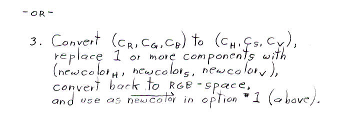 Option 2 might be called "interpolation in HSV space." Since straight lines in RGB space are not straight in an HSV space, interpolating in HSV produces a different effect than interpolating in RGB. The exact difference depends on which HSV space is chosen. For example, linearly interpolating halfway from pure red, which is (R,G,B) = (255,0,0) (assuming 8-bit values), to pure green, which is (0,255,0), yields (128,128,0), which is a dark yellow. Using the single-hexcone HSV space described in section 13.3.4 of the textbook, pure red is (H,S,V) = (0o,1,1), and pure green is (120o,1,1). Interpolating halfway between them yields (60o,1,1), or (255,255,0) in RGB space, which is pure yellow. This is the interpolation method we are asking you to implement in project #1.