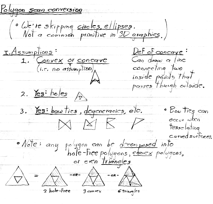 In general, a polygon rasterizer should fill only and all sample positions that fall inside polygon edges. In previous versions of project #2, we also required students to rasterize their polygons such that they meshed perfectly, i.e. with no holes or doubly-drawn pixels. To satisfy this requirement, care must be taken when sample positions coincide with polygon edges or vertices, as discussed above. This year, we do not require this. Thus, you can ignore these rules, at least for the project.