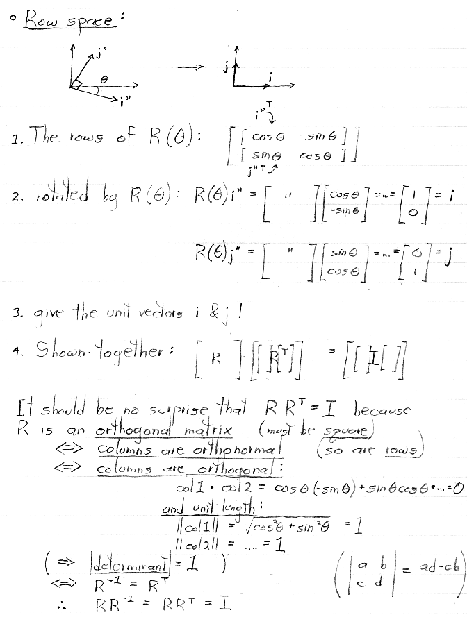 In other words, an orthogonal matrix transforms its rows, taken as column vectors, into the standard basis vectors. Among the many facts listed above about orthogonal matrices, we will make particular use later in the course of the fact that the inverse of an orthogonal matrix is equal to its transpose.