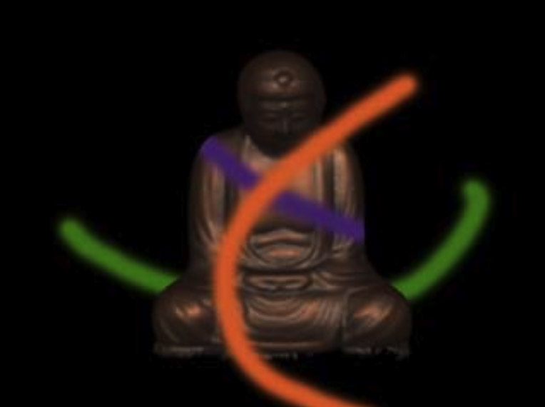 Question for thought: What compositing formula was used to create this image? Treat the background, the buddha, and each airbrush stroke as a separate image having color and alpha channels. Your formula should be of the form "A op1 B op2 C op3...", optionally with parentheses, where A, B, and C are images and op1, op2, and op3 are taken from the list of 12 Porter and Duff compositing operators.
