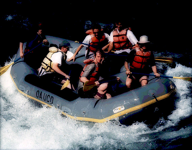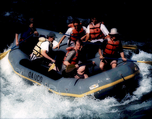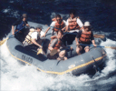 The second test image is an optically scanned photograph taken by a film camera. The optical scanner had a gamma of 1.0, thereby producing a file whose pixel values are proportional to luminance. The third row of the table shows quantization of this image. To my eye, it begins to show quantization artifacts at 5 bits, but less severely so than the synthetic image, probably because of film or digitization noise. Look in particular at the top surface of the leading edge of the raft. In the second row of the table, the same image has been raised to the power 0.5, making pixel values proportional to perceived brightness. The image in the left column shows the result of this gamma transform. The transformed image is then quantized in that space, and resulting quantized images are raised to the power 2.0 to restore the original color levels, so that they can be compared on the same display at the same time to the third and fourth rows. These quantized and restored images are shown in the rightmost three columns. To my eye, this version exhibits fewer artifacts than the third row. For further comparison, in the fourth row the same image has been raised to the power 2.0 - exactly the wrong gamma transform for human viewers, quantized in that space, then raised to the power 0.5 to restore the original color levels. This version clearly exhibits more artifacts than the second or third rows.