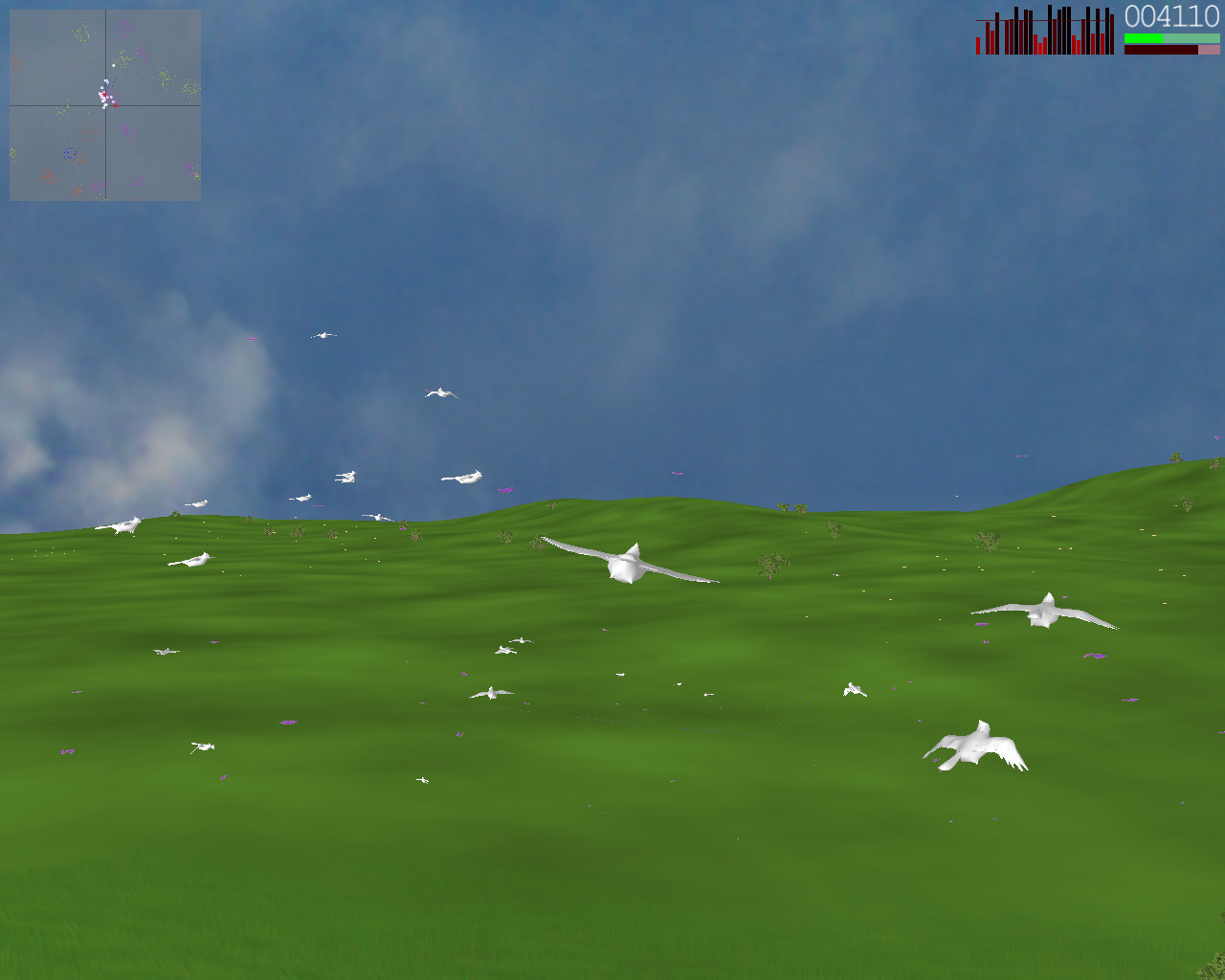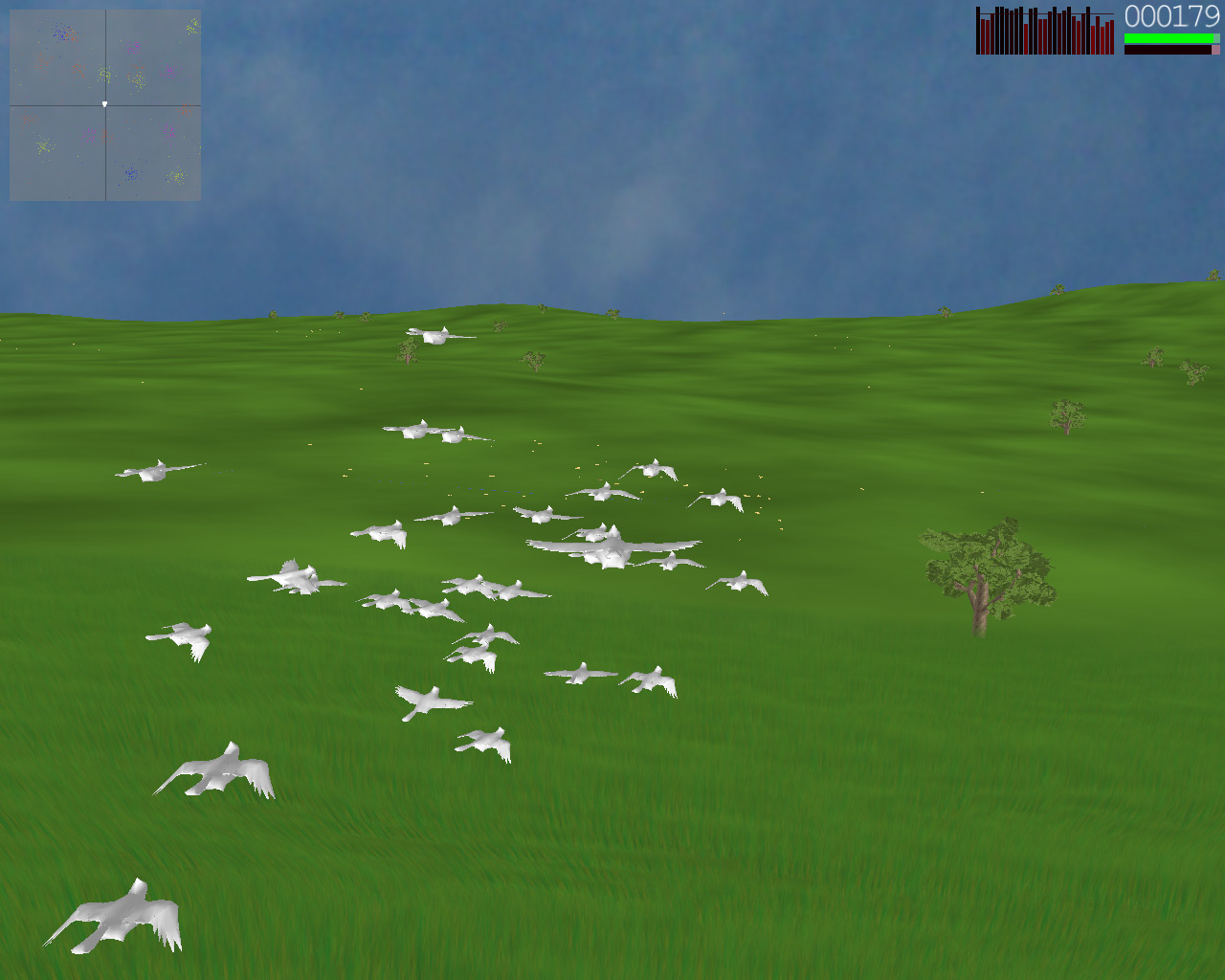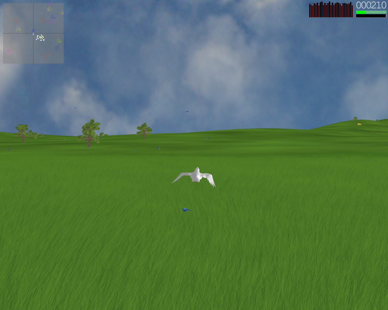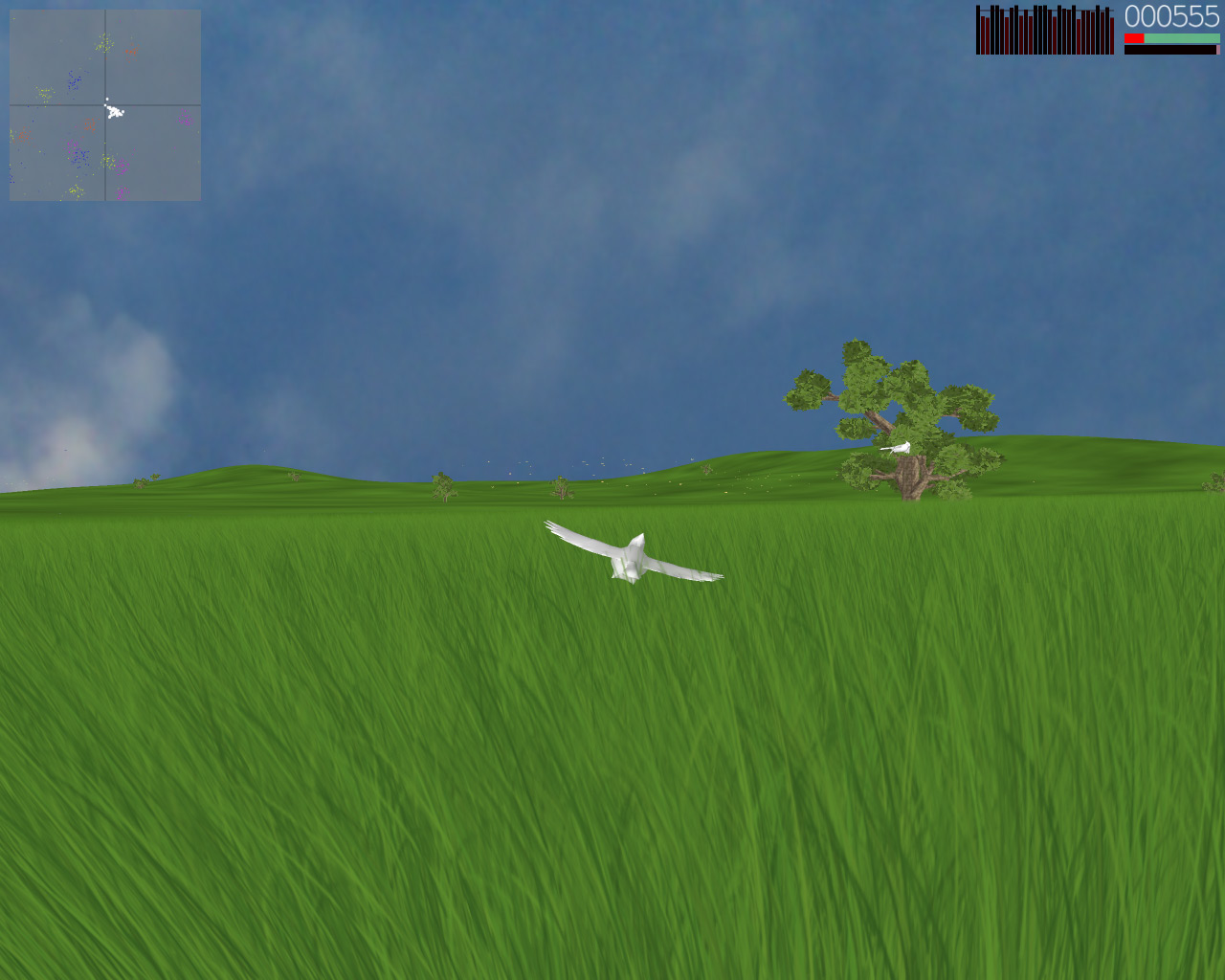 In Flock, you are a bird in a flock of birds that seems to trust you at least as much as you make good decisions. They tend to follow you around if you look like you know what you're doing and they will eat any butterfly in sight. Some butterflies are healthy, some are fun to eat, and some are poisonous. Unfortunately, the birds don't remember which one is which and after they finish eating a group of butterflies, they often don't know where to go next! Fortunately for you, you were born with a butterfly finder in your brain and you can find new groups of butterflies instantly and you know exactly which butterflies are good for your flock, which butterflies they love to eat, which butterflies are bad for them, and most importantly, which butterflies give you the most points. Even though you have these wonderful talents, the flock still often questions your decisions. If you dart off without waiting for them, they may not follow you and if you lead them towards poisonous butterflies, they will start to lose confidence in your decisions once they start seeing their flockmates dropping to the ground. It's your responsibility to keep you and your flock together and alive for as long as possible. Flock was written in the fall of 2002 by Eric Berger and David Chan for Stanford's CS248, taught by Marc Levoy. It won the "Most Creative" award in the 4th Annual CS248 Video Game Competition. The engine for Flock is quite sophisticated. The terrain that you fly over is generated analytically and the terrain engine is so robust that you can fly in any direction forever. The grass that you swoop through is really there, swaying gently in the calm breeze. Those trees that you fly around are procedurally generated and billboarded when needed. Those birds are flying using realistic flocking algorithms similar to those used in Batman Returns and The Lion King. More details on these features and more can be found in our details page.