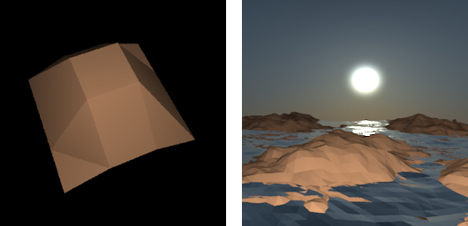 The 4x4 heightfield in hftest.pbrt (left image) is designed for debugging; use this file as you develop and test your intersection algorithm. The landsea-0.pbrt contains two 64x64 heightfields (land and sea) and there are several views of this scene (0-3). landsea-big.pbrt contains a 1000x1000 heightfield and will likely take a while to render and consume loads of memory in the process.