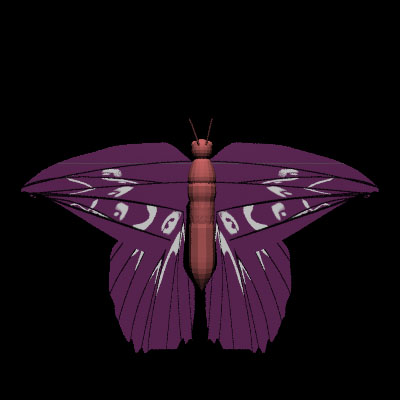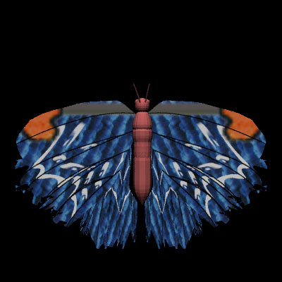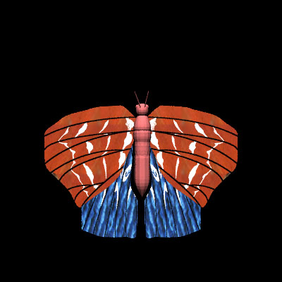 The wings were modeled using a NURBS on a plane. We wrote curve object to support cubic curves that would maintain C-2 continuity. Curve points can be specified arbitrarily and the control points automatically adjusts to maintain smoothness and C-2 continuity. We took measurements from pictures of actual butterfly wings to form the basic shape for our wing generation algorithm. The wing was broken down into a set of fundamental control points each specified by a angle and length from the butterfly's shoulder. The shape of the wing outline could be changed in three fundamental ways: