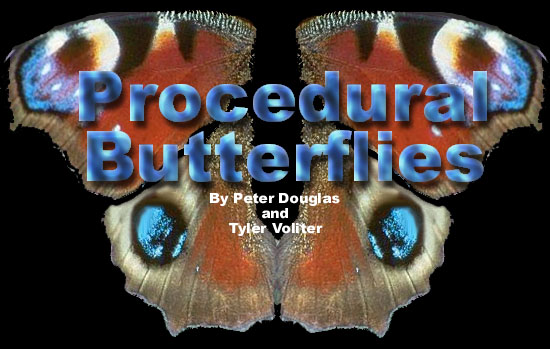 Butterflies are beautiful composites of wonderful fractal patterns, geometry and surface properties. Our goal was to understand and replicate some of these properties to procedurally generate, with parameterized input, a variety of butterfly models, with slightly varying reflectance/surface properties, coloration, and geometry. We planned to model the reflection/iridescence, texture, and fractal-like outline of the butterfly wings.