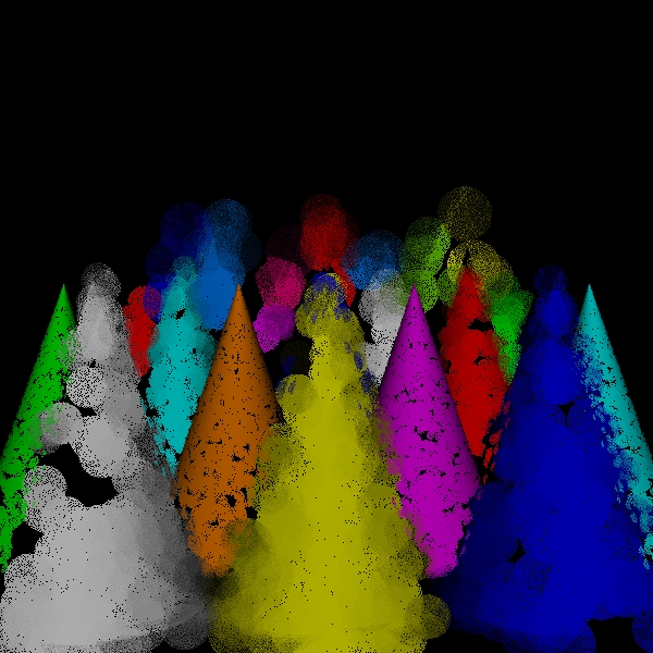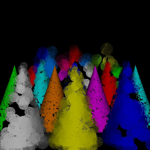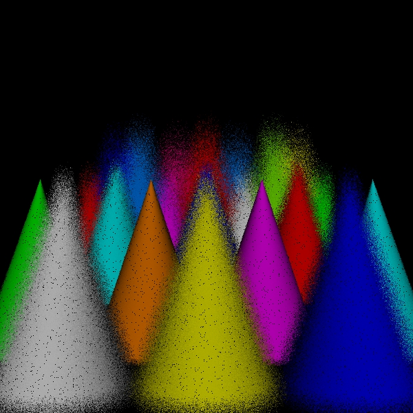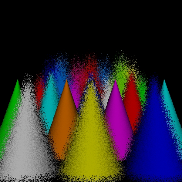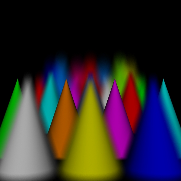 While the sampling of directions for shading should be increased to approach the correct solution in the limit, one of the versions of the algorithm that I have implemented simply uses one shading ray to process each scene point intersection. This is both for simplicity and to see how well the simplest approximation performs. Because the circles of confusion are flat shaded like spots, I call this the spots version. I call the original version the disks version to distinguish it from the spots version for lack of a better name.