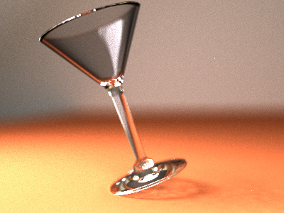 The final image made use of 2025 samples per pixel (!) to achieve low noise and good depth of field effect, with 300,000 caustic photons and 100,000 volumetric photons. The radiance estimate was computed using 100 photons. A lot of the caustic photons were not productive because they hit other areas of the glasses; it would have been more productive to concentrate the photons on the base of the glasses where they have the most effect.