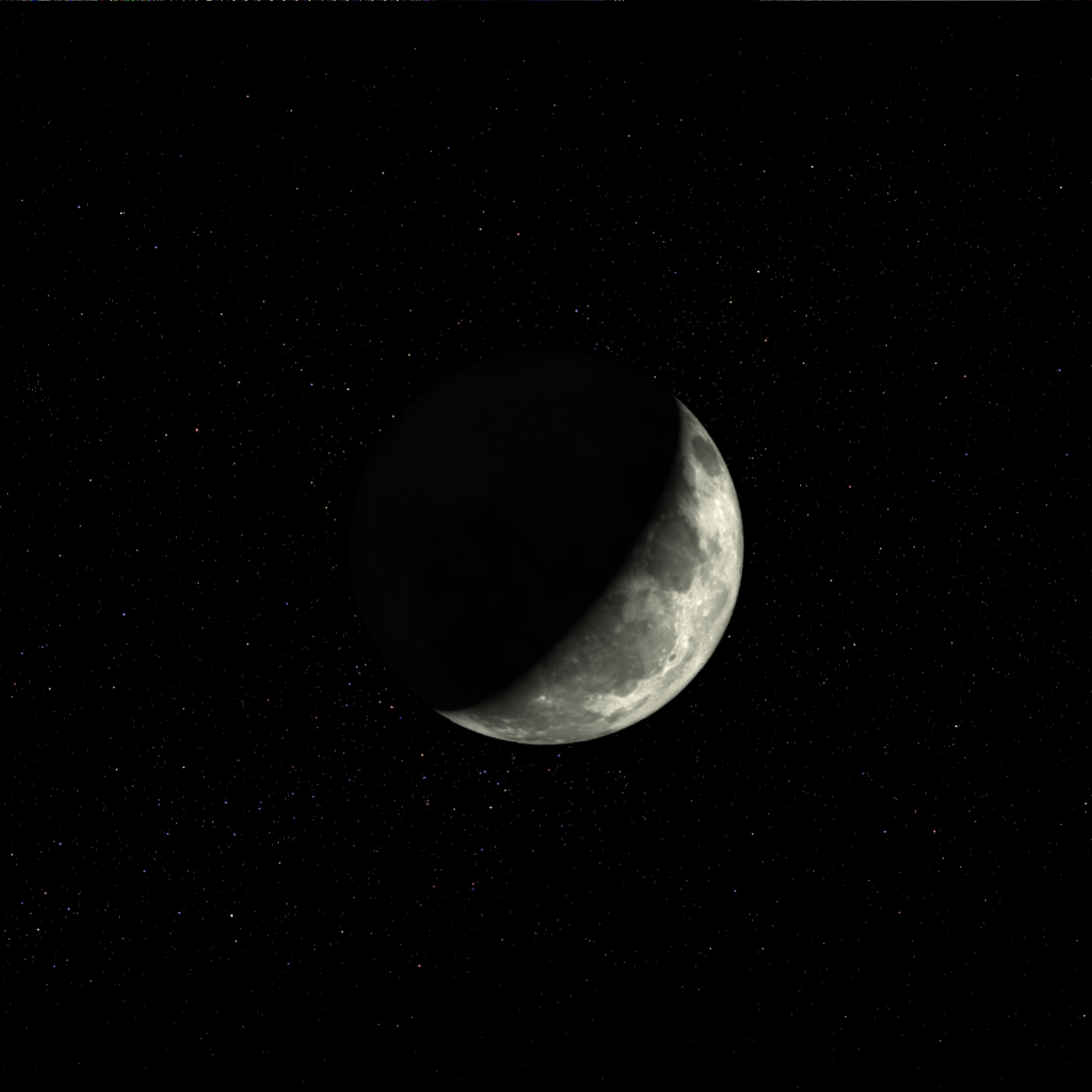 Here is a picture of a crescent moon with no stars. Notice the earthshine lightly illuminating the dark part of the moon. This is the moon that was in the sky on the day both of our intrepid night renderers were born.