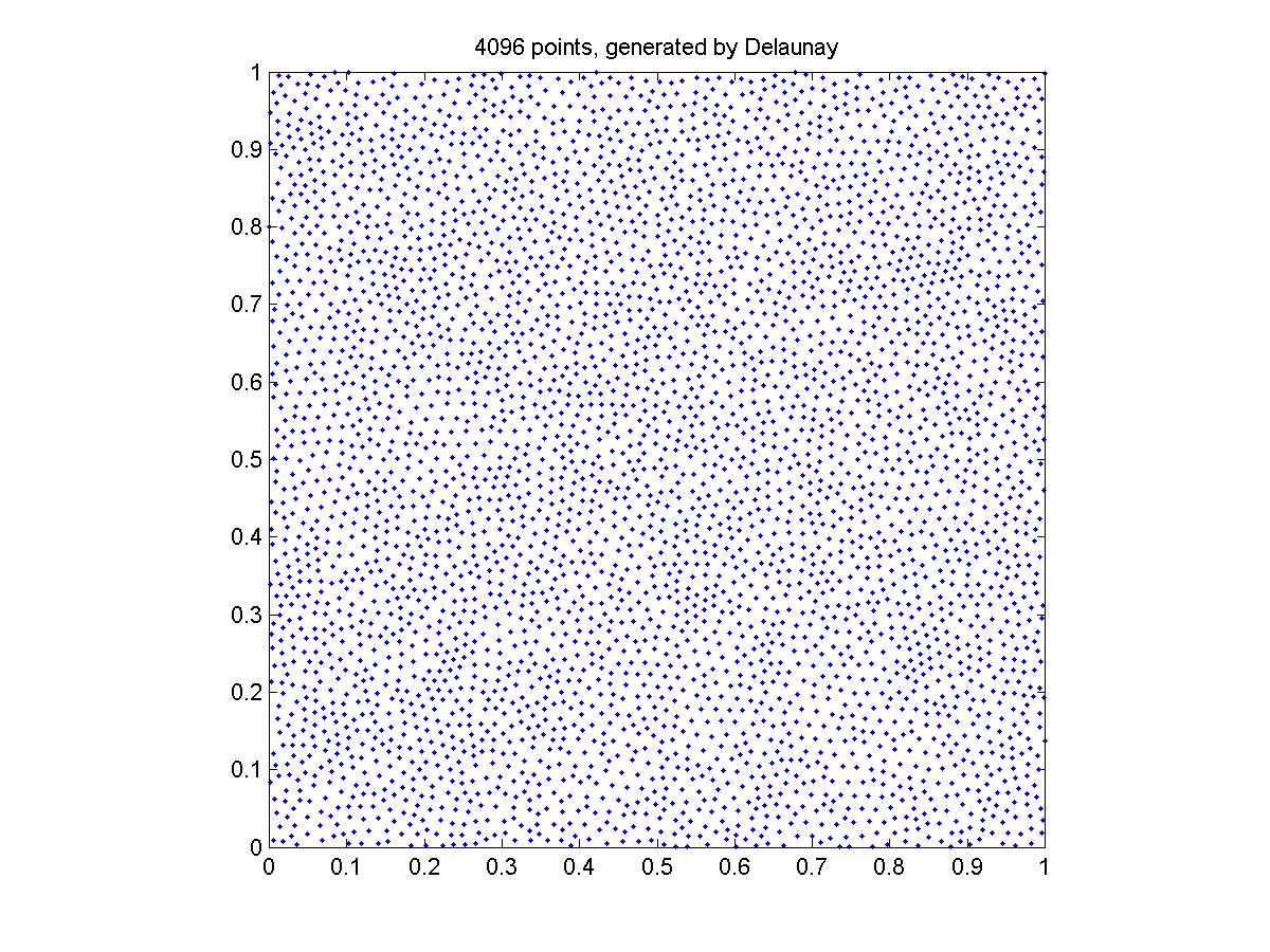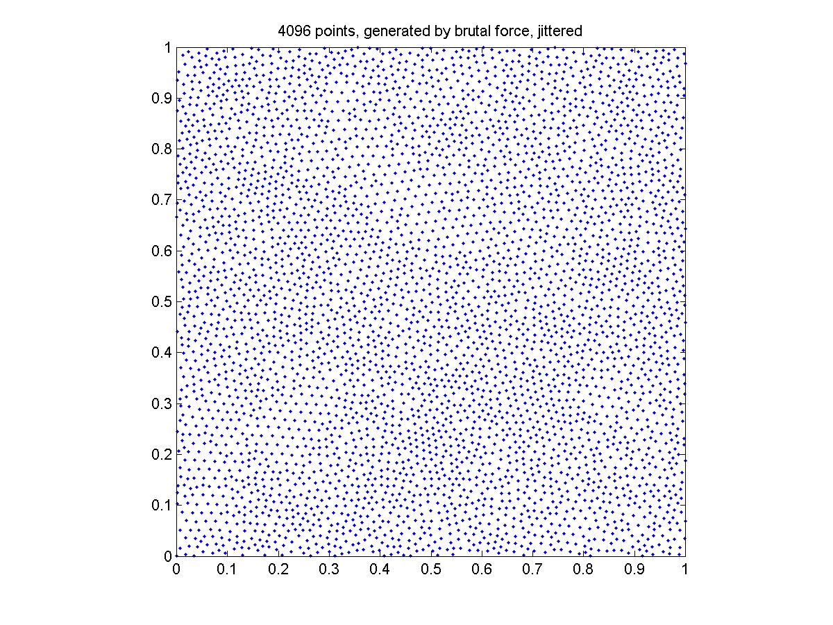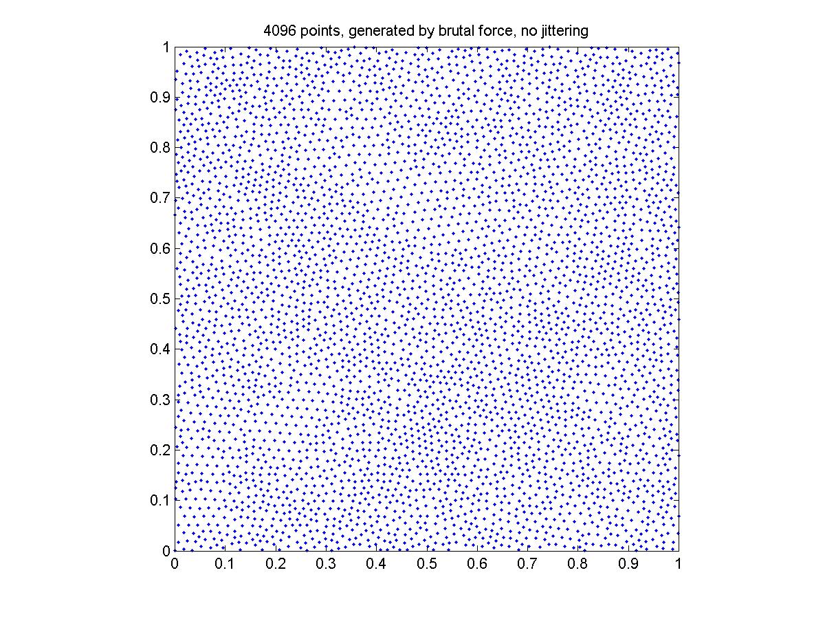 The points generated by the brutal force don't seem to cover the square as uniformly as the other two methods. I think this is because the grid is not fine enough. I guess 10000*10000 will be sufficient for 4096 points.
