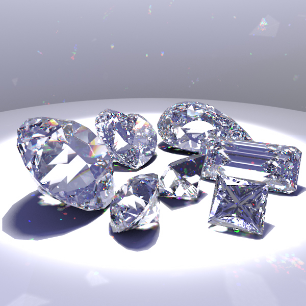In my proposal, I set out to model some sort of wavelength-dependent surface interaction, as I've always been fascinated with the rainbow-like effects produced by such phenomena. I decided on the gemstone idea for several reasons: gemstones exhibit amazing physical properties not often seen in day-to-day objects; I was inspired by a Siggraph 2004 presentation on gemstones; and I found two papers by Sun et al that discussed the implementation issues of light dispersion in a standard ray tracer. The two images I used as references are displayed below; one shows the amazing dispersion effects in the Century diamond, and the other shows a scene I sought to duplicate.