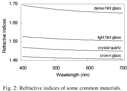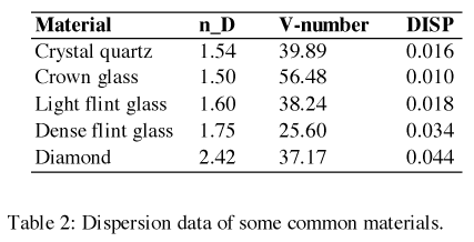 Note that, in the crystal, the center of the 'dispersion rainbow' is white rather than green, as light sources are typically area rather than 'delta' so, at the rainbow middle, all wavelengths of light reach the area light. This is characteristic of most real-world dispersion. Refractive index as a function of incident wavelength is given in the graph below for various dispersive materials. This function is typically simplified to two values: n_D, the index of refraction at wavelength 589.3nm, and DISP, the difference in index of refraction between wavelengths 430.8nm and 687.0nm, as displayed below.