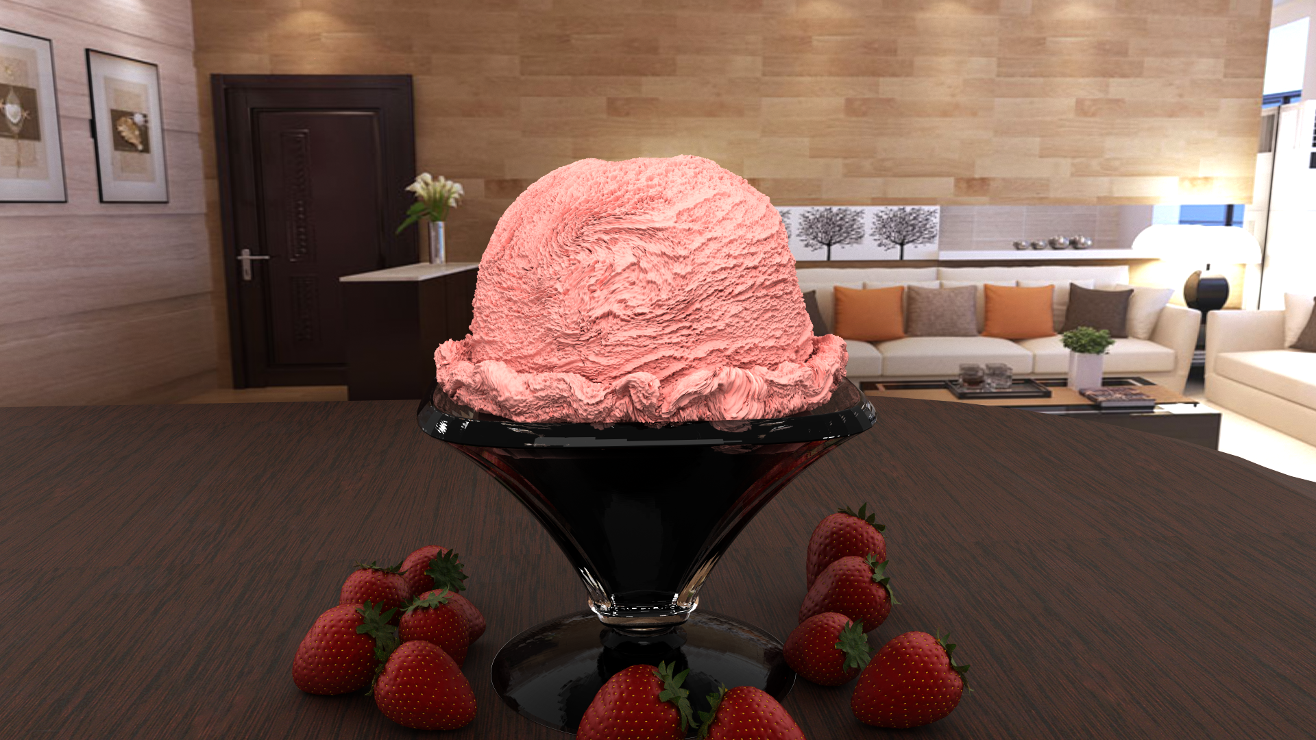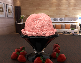 Brennan and Peter used a mix of fluid simulation and simplex noise to model ice cream, and implemented a sophisticated subsurface scattering model for the material. [
