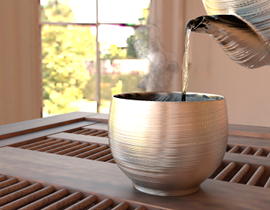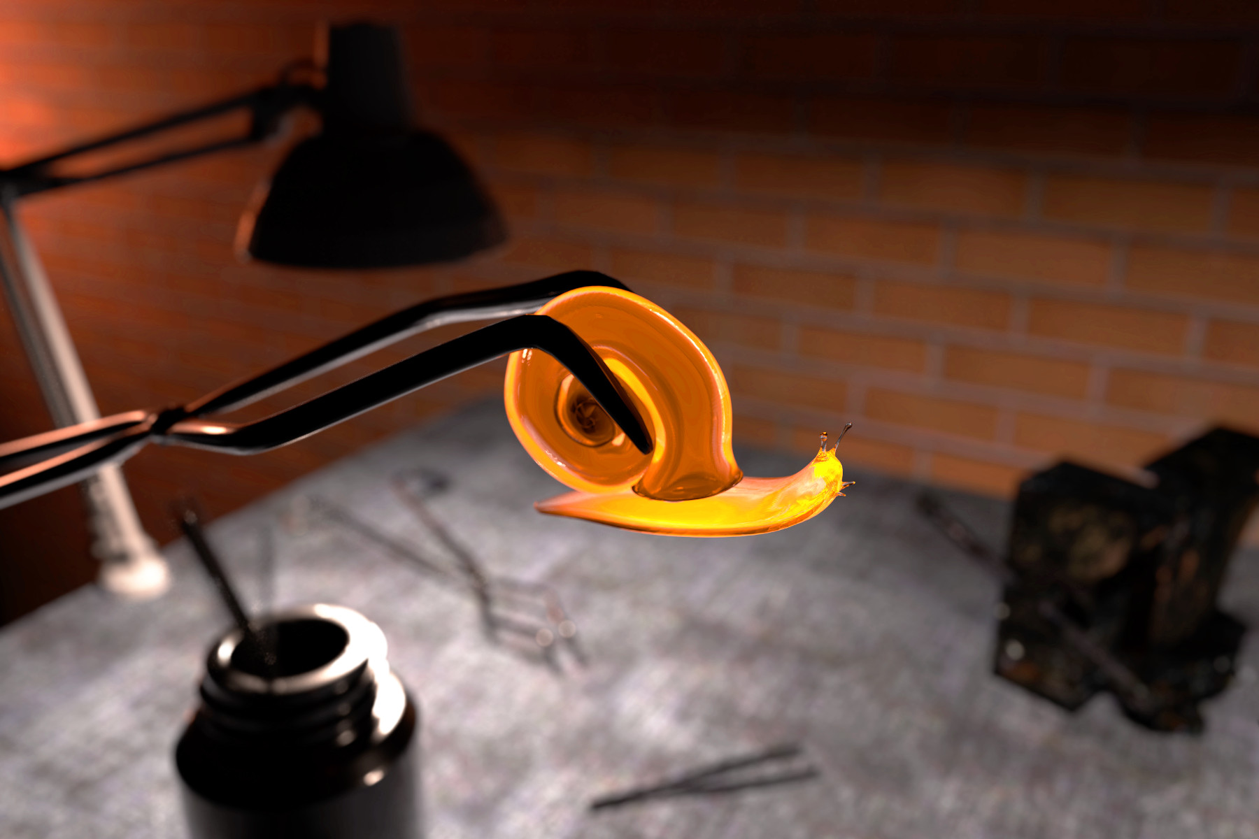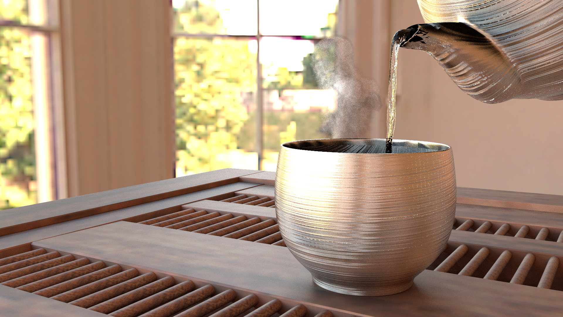 Sean implemented equiangular sampling for heterogeneous media, which was used to efficiently render steam. Toki implemented 4D Gaussian mixtures to capture the specular microstructure of brushed metal, and Wilbur modeled the scene and ran the fluid simulations. Together they produced this subtly complex image combining steam, fluids, and brushed metal. [