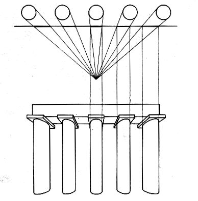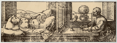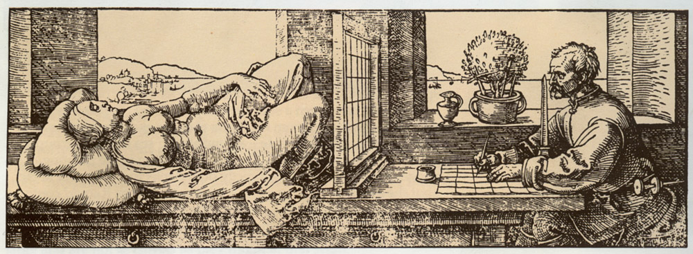 I. Perspective. Although the mathematics of perspective were discovered by Philippo Brunelleschi in the early 1400's, teaching artists how to construct correct perspective images was not easy. In this 1525 woodcut, Albrecht Durer demonstrates the use of a Draftsman's Net. A wooden frame covered with a grid of black threads, together with an eyepiece - represented here by a small obelisk - permitted an artist to replicate the scene before him onto a drawing surface ruled with a matching grid. We will repeat his demonstration in class. Nobody will be asked to undress.