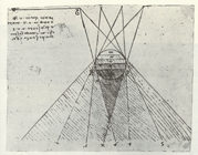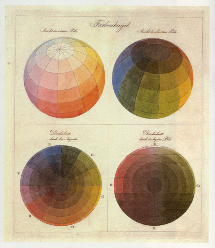 II. Scientic illustration. While the ancients were careful observers of nature, their knowledge of human anatomy was deeply flawed, and their scientific treatises survive only as text - no figures. Shown here is a print from Andreas Vesalius's seminal 1543 book, On the Fabric of the Human Body. With these precisely shaded and carefully labeled drawings, he revolutionized both the study of human anatomy and the art of scientific illustration. In this course we will try creating our own technical illustrations. Nobody will be flayed. III. Light and shadow. The notebooks of Leonardo Da Vinci (1452-1519) include many studies of penumbrae - the zone of partial shadow created when an object occludes only part of a light source. Despite his legendary powers of observation, Leonardo's writings contain misconceptions about how shadows are formed. A scientific understanding of these phenomena came only two centuries later, with the work of Lambert, Bouguer, and others during the European Enlightenment. We will repeat many of their crucial experiments in class. IV. Color. Since antiquity, artists have struggled with the question of how to organize colors into scales. Despite contributions by Newton and others, human color vision remained a mystery until the 1800's, when Young and Helmholtz proved that colors occupy a 3D space. After them, writers experimented with many ways of organizing this space. Here is a spherical arrangement proposed by Philipp Runge in 1810.