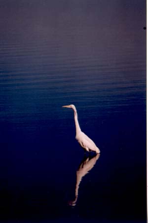 | This image of a heron reflected on a smooth section of the bay is interestingly displays the shift of perspective caused by reflections on water and the slight distortion caused by ripples on the surface. It is also an interesting photo for the effects of water color-- the ocean changes from near black to a rich royal blue to a light grayish. |