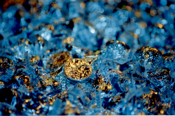 | Blue hershey's kisses? In fact, these are normal silver Hershey's kisses. The bluish pattern is entirely a reflection, created by tinting the camera's flash with a bluish tint before taking the picture. |