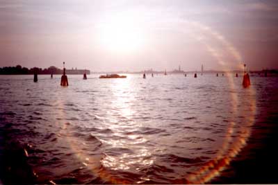 | Late afternoon sun on the water near Venice. This photo displays an interesting "corona" in addition to the normal vertical highlights on the water. However, I suspect that this may be a false corona, caused by reflections on the camera lens. |