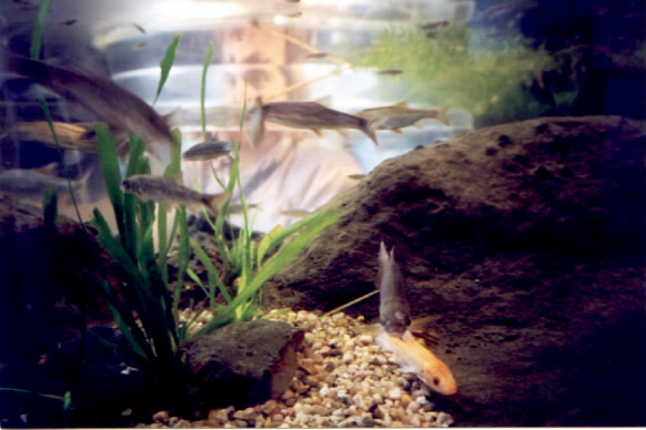 | An interesting combination of reflection and refraction create the distorted image of the person seen thruogh this aquarium tank. At bottom, the subject seen direcly through the water, at middle the subject is seen through a clear acrylic viewing tube in the center of the aquarium, and at top the subject is seen as a reflection on the inside of the top surface of the water. |