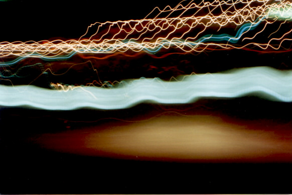 | Minnaert may not have mentioned this, but this interesting pattern of lights is easily reproduced. It is the result of placing a camera on the dashboard ofa car and locking the shutter open for a long (maybe 30 second) exposure. The forward movement of the car combined with the up and down vibrations of the car creates an interesting streaking pattern from passing lights. At bottom, the bright white splotch comes from the car's own headlights. |