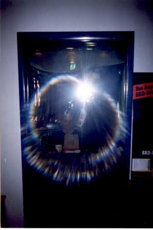 | Another "corona" pattern I captured. This time, instead of being caused by a reflection on the camera's lens, the corona is caused by reflection of the light from the camera's flash acrossed a "funhouse" style mirror. It is possible to see streaks from where the mirror is scratched (difficult in this reproduction though) as well as a distortion of the circular shape of the corona caused by the distortion of the funhouse mirror. |