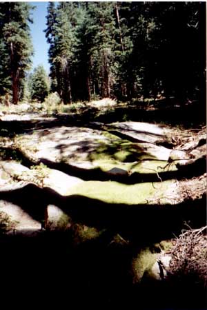 | This is the only picture I could find depicting moss. Though it is taken late in the day, the moss still does not demonstrate much of the "sparkly" phenomena described by Minnaert. However, this photo is still interesting for the shadow patterns caused by the overarching forest. |
