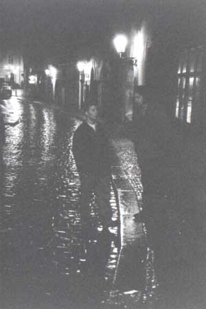 | This image of a damp alleyway in Prague taken with extremely fast (3200 ASA) black and white film does an excellent job of demonstrating the interplay of light acrossed wet surfaces. Note that the light creates long, broken bars acrossed the wet cobblestone road, but more regular diffuse circular shapes in the reflection on the dry wall. |