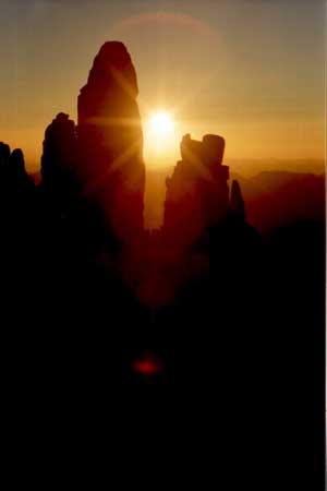 | This photo shows an interesting look at the sunrise over some rocky peaks near Mt. Whitney. Though it's difficult to see in this reproduction, the rising low-level sun displays both a mild corona and "rays" emanating from it. |