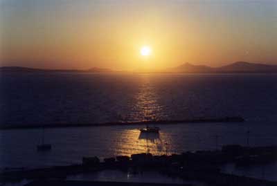 | A sunset in Greece displays a near perfect reflection of Minnaert's triangular reflection acrossed the ocean. |