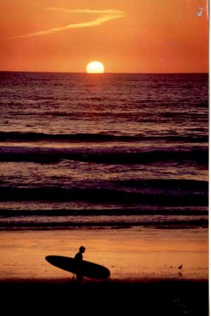 | A surfer silhouetted against the ocean at sunset. Note that the orangish sky is relfected in the smooth damp sand at the bottom, but not the dry beach sand or the rough ocean, creating the silhouette and the overall banded effect of the photo. |