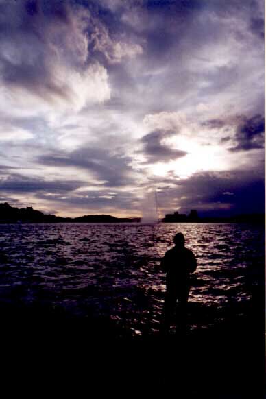 | A dramatic sky at sunset in Stockholm, Sweden. Interesting light and colors in the clouds as well as in their reflection in the water. A sky like this cannot be explained simply by one of Minnaert's observations-- it is a combination of many factors. In addition, this photo displays a silhouette in the foreground, visible because of reflection of light acrossed the water (Minnaert describes this phenomenon with sailing ships, but not with people standing at the shoreline.) |
