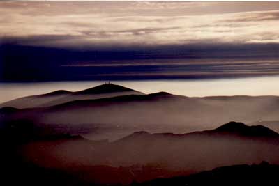 | A bizarre sunset seen from the summit of Mt. Woodson, CA. Though this reproduction is not very good, the clouds at center display stripes of blue and gold, while above and below, the sky is white. I believe that these stripes are caused in part by shadows from the above white clouds (described by Minnaert) as well as the normal sunset color effects. At bottom, a demonstration of scenery being obscured by low-lying clouds. |