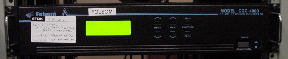 The Folsom scan converter turns computer monitor output into standard video in real time. Thus it converts from something in the high-bandwidth RGBS monitor patch panel into many levels of the Telect - NTSC, CAV, and RGBS. You generally use it for recording from a live monitor session to tape. See tutorial
