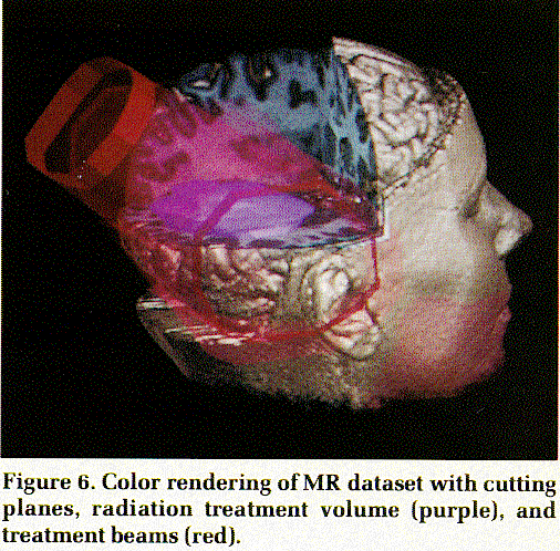 Figure 6. Color rendering of MR dataset with cutting planes, radiation treatment volume (purple), and treatment beams (red). |