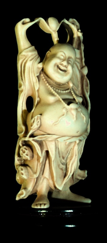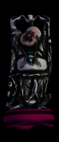 Figure 1 shows a photograph of the Stanford Happy Buddha statue illuminated with spotlights from the front and side. Figure 2 shows a photograph of the effect of projecting computer renderings onto the statue from the same directions. These renderings, made from a 3D model of the statue, consist primarily of an accessibility shading of the model geometry. They are similar to renderings made for the 3D fax project.