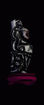 Although specular reflections from the surface of the real object are typically unwanted, and they may even destroy the visual illusion, as discussed above, they can also be used to advantage in certain circumstances. In figures 3 and 4, the projected images are neutrally colored, hence the specular highlight appears white, and the statue appears to be made of plastic. In figures 9 and 10, the statue base is given a purple cast. This causes the specular highlight to appear colored, producing a strong illusion that the base is made of metal.