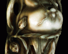 2. The projectors must be well matched, calibrated and aligned. We used different projectors with strongly different color characteristics. Fortunately, the eye readily ascribes such differences to the illumination conditions and therefore does not find this error objectionable. However, failure to properly calibrate and align the projectors is fatal to the success of this illusion. Many hours were spent at this task, and the task was made more difficult by using a copy of the statue that differs from the version scanned. As an example of the importance of proper alignment, slight errors in the aiming of our Davis projector are visible along the the left edge of the amulet in figure 7.