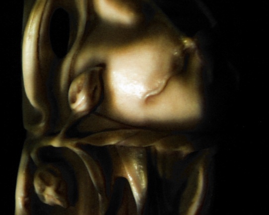 Figure 3 shows the rendering created for projection onto the side of the statue, and figure 4 shows the rendering created for projection onto the front of the statue. Due to the limited availability of projectors for this ad-hoc experiment, projectors from two different manufacturers were employed, a Sony for the side image and a Davis for the front image. The difference in minimum field of view between the two projectors accounts for the different sizes of the rendered statue in the two images.