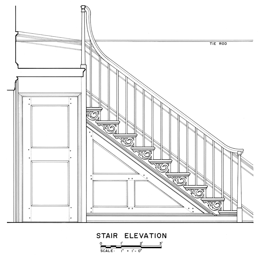 The other drawing I made of Rural Mount showed some of the interior details, including the main staircase and one of its decorative brackets. Click here to see the drawing at 100 dpi, and click here for a blowup of just the stair elevation. The brackets are interesting because they resemble designs from builder's handbooks of the late 18th century. As such, they are one of the elements used to verify the date of construction of the house. |
