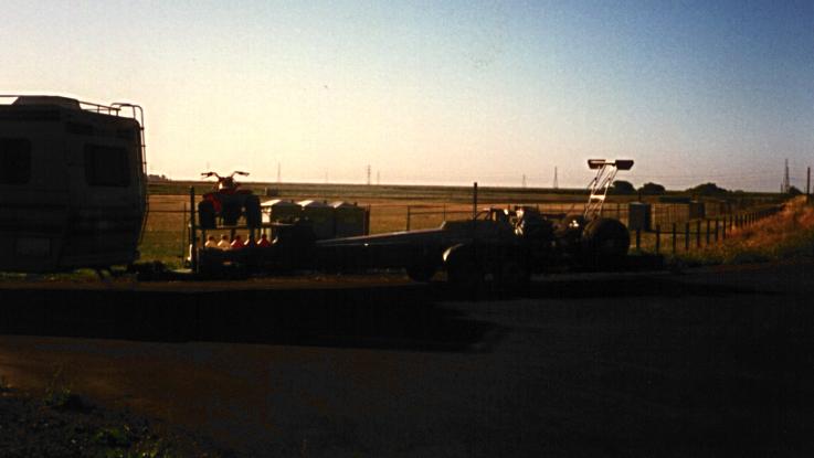 A dragster on a trailer, parked on the side of highway 121 near Sears Point Raceway.